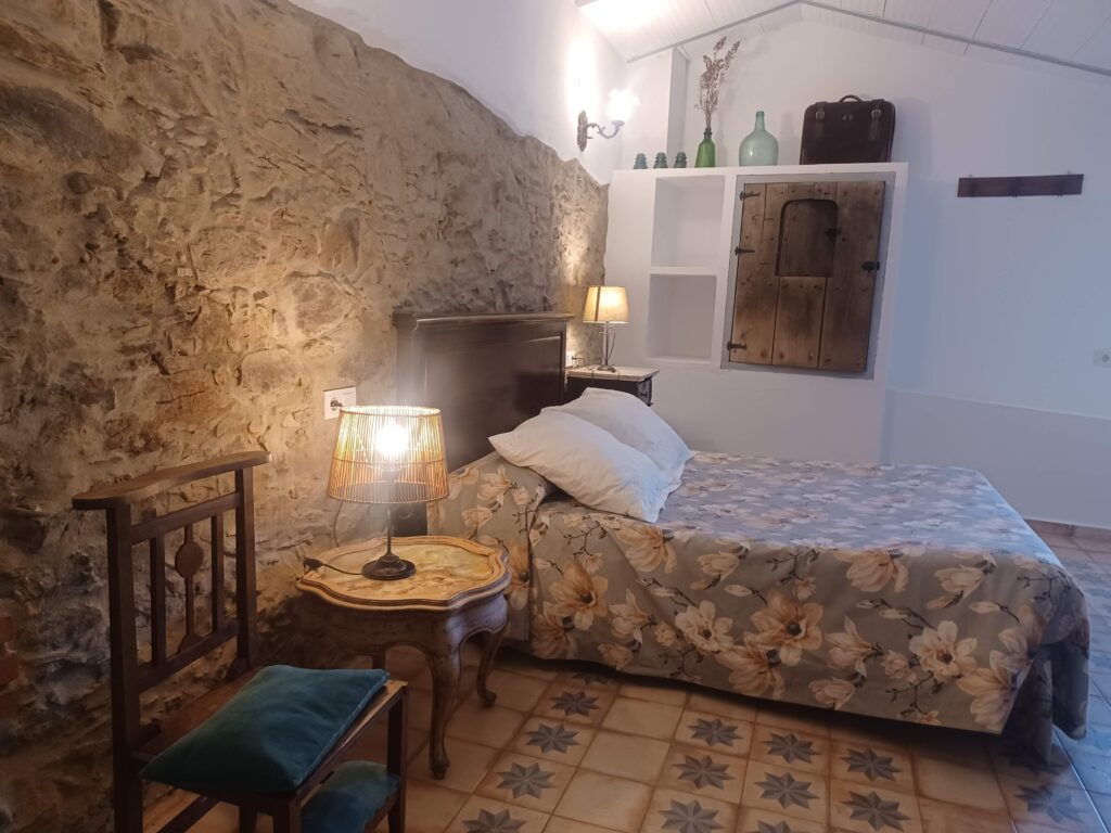 La casa mantiene su arquitectura original con gruesos muros de piedra y un tejado de teja árabe, reflejo de la construcción típica de la época.
